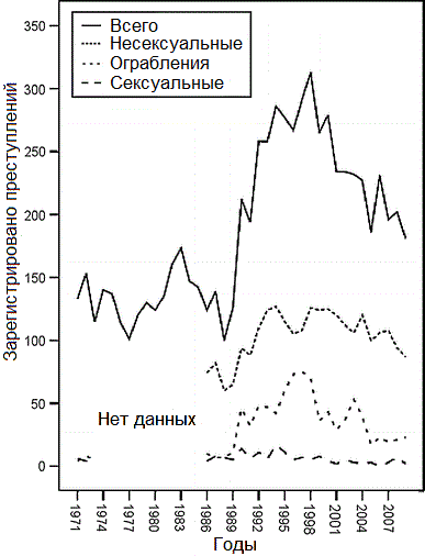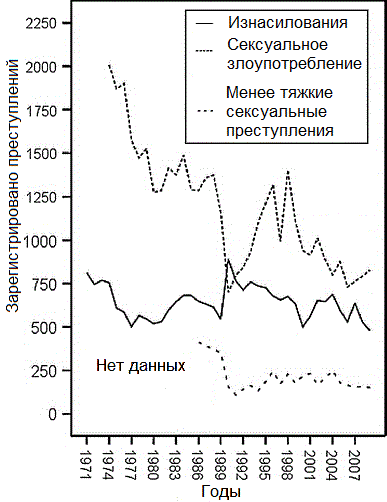 Рис. 1 Количество изнасилований, сексуальных злоупотреблений детьми и менее тяжких сексуальных преступлений (напр. "непристойного обнажения"), зарегистрированных в 1971-2009 годах. До 1986 г. данные о менее тяжких сексуальных преступлениях не сохранялись. Данные о сексуальных злоупотреблениях детьми за 1971-1973 гг. не доступны.