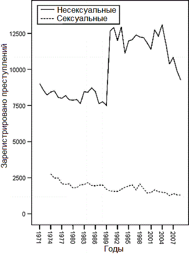 Рис. 3 Количество зарегистрированных сексуальных (изнасилование, сексуальное злоупотребление ребенком) и несексуальных преступлений (умышленное нанесение побоев и ограбление) в 1971-2009 гг.