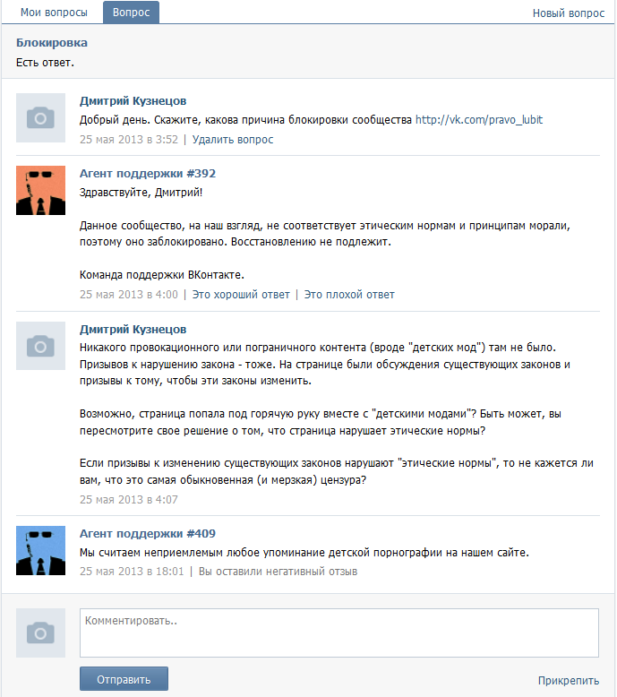 Но сейчас ситуация резко поменялась, все подобные сообщества были забанены, причем под раздачу попали и некоторые вполне серьезные (не имевшие провокационных целей) страницы. В частности, была заблокирована моя страничка "Педофилия и детская порнография: опасно ли это?" В связи с этим у меня произошел следующий диалог с администрацией Вконтакте: